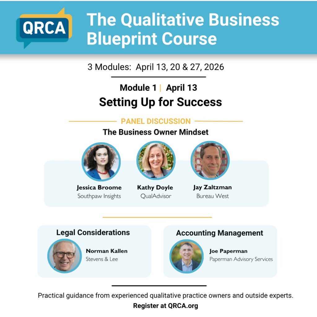 In “Module 1: Setting Up for Success,” Norman will join speakers Jessica Broome of Southpaw Insights, Kathy Doyle of QualAdvisor, Jay Zaltzman of Bureau West and Joe Papermen of Papermen Advisory Services for a discussion that explores foundations of qualitative business ownership. Norman will provide particular insights on legal registration and contracts in a conversation that also covers accounting setup and navigating workflow highs and lows.